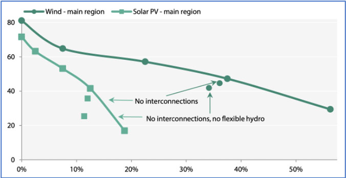間歇性電源滲透率上升后,對系統(tǒng)成本的影響呈現(xiàn)邊際遞增趨勢。與行業(yè)慣用的全生命周期平準(zhǔn)化度電成本(LCOE)相比,系統(tǒng)成本主要反映電源對電網(wǎng)系統(tǒng)的影響,如備用電源、調(diào)峰調(diào)頻、輸配電線路增加及加固成本等,在可再生能源占比高的情形下尤顯重要。有關(guān)系統(tǒng)成本概念,可詳見《從LCOE到系統(tǒng)成本》。