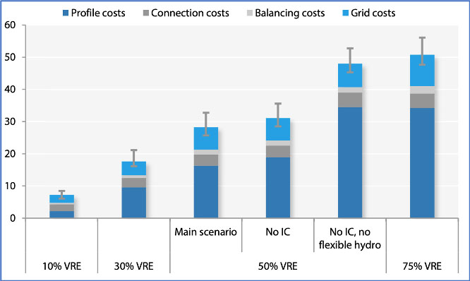 在案例地區(qū),當(dāng)可再生能源滲透率為10%,系統(tǒng)成本約為7美元/MWh(折合人民幣4.76分/kWh)。當(dāng)滲透率提高到30%,系統(tǒng)成本翻倍至17.5美元/MWh,滲透率達(dá)到50%時(shí),系統(tǒng)成本則進(jìn)一步攀升至30美元/MWh。