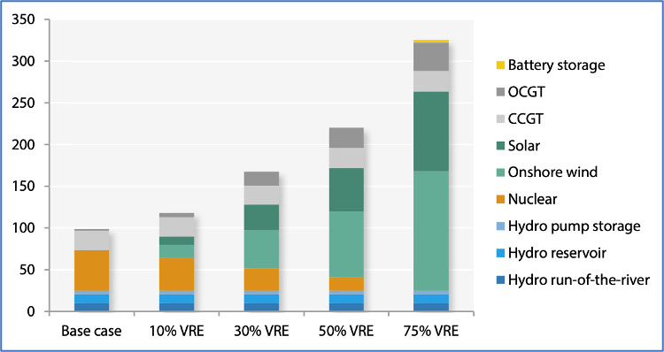 但實(shí)際可能產(chǎn)生的變化遠(yuǎn)不止于此。2019年,OECD/NEA曾發(fā)布《The Costs of Decarbonisation》,以一個(gè)年用電量5370億kWh的地區(qū)(如法國)為例,研究在當(dāng)前裝機(jī)格局的基礎(chǔ)上,當(dāng)風(fēng)電、光伏合計(jì)滲透率分別為10%、30%、50%、75%時(shí),區(qū)域在系統(tǒng)成本、可靠性、電價(jià)等方面的顯著變化。