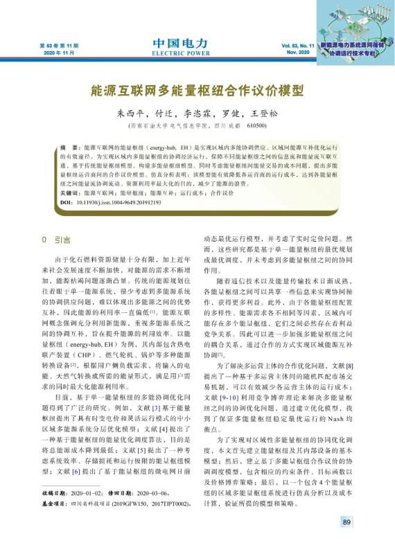 朱西平, 付遷, 李恣霖, 等. 能源互聯(lián)網(wǎng)多能量樞紐合作議價模型[J]. 中國電力, 2020, 53(11): 89-96.
