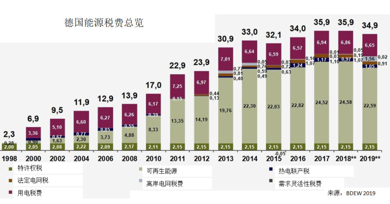 相比之下,下圖說明了電價稅和稅收的增長,主要用于為資本密集型可再生能源的推出提供資金: