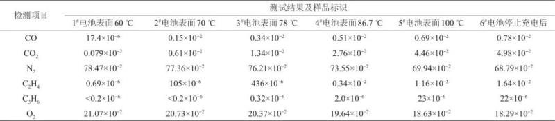 文獻[7]通過對不同正極材料的鋰離子電池的熱失控特性進行研究,發(fā)現(xiàn)正極材料分別為三元材料、錳酸鋰材料以及磷酸鐵鋰材料的電池,出現(xiàn)著火時表面測得的溫度分別僅為56.3 ℃、75.2 ℃以及120.4 ℃,而電池熱失控早期都會產生冒煙的現(xiàn)象,所產生的小分子特征氣體濃度會由0驟增至幾百甚至幾千毫克每立方米。因而相較于溫度參數(shù),電池熱失控生成的特征氣體更適合做預警的判斷依據(jù)。