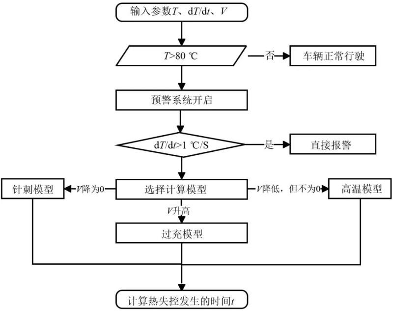 文獻[14]針對18650圓柱形電池進行穿刺試驗,探索電池包電壓與電池熱失控的關聯(lián),發(fā)現(xiàn)在穿刺試驗中電池包的電壓并無規(guī)律可循,對于其他的誘因引發(fā)的熱失控,電壓變化可能更為復雜,電壓作為電池熱失控唯一的表征參數(shù)并不合適。因而電壓不能作為判定熱失控的唯一參數(shù)。文獻[15]通過分析不同濫用工況所導致的熱失控,提出了以觸發(fā)機制為條件的分情況預警方案,通過監(jiān)測電池的溫度、升溫速率及電壓數(shù)據(jù),代入不同觸發(fā)機制下的預警系統(tǒng)模型計算出將要發(fā)生熱失控的時間,其預警步驟如圖4所示。