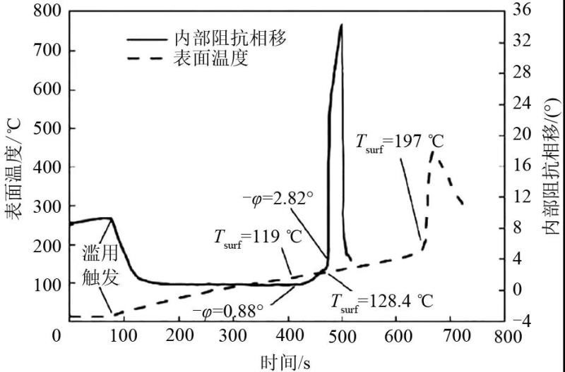 圖3 熱失控過程中鋰離子電池內部阻抗相移和表面溫度變化曲線