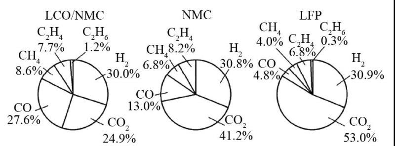 電池熱失控通常伴隨的不僅僅是溫度的升高,還會有大量煙霧和CO、C2H4、C2H6、C3H6、H2等可燃氣體生成,文獻[5]在不低于130 ℃的情況下針對不同正極材料的電池所產生的氣體進行了采樣分析,其組分如圖2所示。