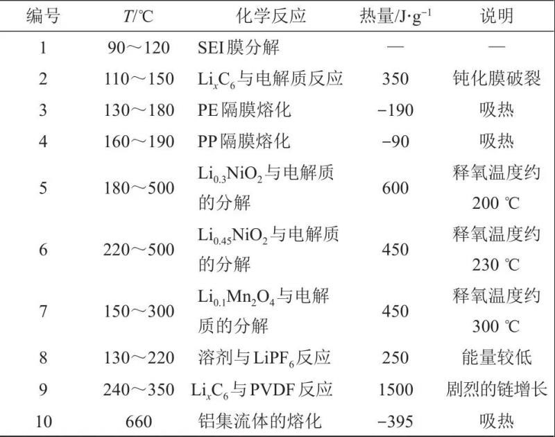 電池熱失控的機理,從低溫到高溫電池會經歷如下過程:SEI膜的分解;電解液與負極的反應;隔膜熔化過程;正極的分解反應;電解質的分解反應;黏結劑分解及電解質燃燒反應。表1總結了電池在熱失控過程中在不同溫度區(qū)間發(fā)生的反應以及所放出的熱量,目前部分學者將120~150 ℃,即電池隔膜開始出現(xiàn)熔化的溫度視為熱失控發(fā)生的溫度。