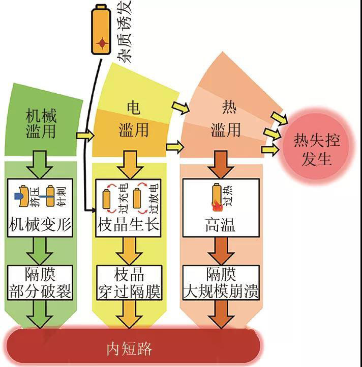 對于鋰離子電池熱失控的誘因,大致可分為3個原因:機械濫用、電濫用和熱濫用。圖1概括了電池熱失控誘因,從圖中可以清晰地看出這3種誘因都會使電池出現(xiàn)內短路,最終導致了熱失控的出現(xiàn)。通常不同誘因引發(fā)的熱失控,產生的現(xiàn)象會有一定的差異,但是其機理都是相似的。