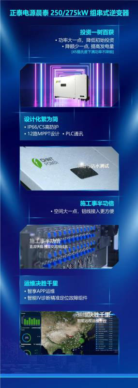 正泰電源沉淀10余年光伏逆變技術(shù)積累、25個(gè)國(guó)家行業(yè)應(yīng)用經(jīng)驗(yàn),經(jīng)兩年潛心鉆研正式向市場(chǎng)推出最新的組串式光伏逆變器——晨泰系列。晨泰SCH250/275KTL組串式光伏逆變器是當(dāng)前全球功率最大的組串式逆變器,45攝氏度下滿功率不降額,采用IP66/C5高防護(hù)設(shè)計(jì),最高轉(zhuǎn)化效率可達(dá)99%。本次獲得中電科高低穿測(cè)試認(rèn)證,是該系列產(chǎn)品對(duì)電網(wǎng)友好性有力的證明,更是對(duì)正泰電源的技術(shù)實(shí)力體現(xiàn)。