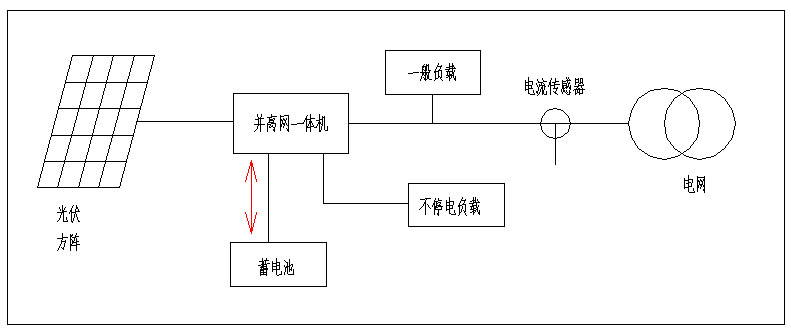 并離網型光伏發(fā)電系統(tǒng),安裝在用戶側,系統(tǒng)由太陽電池組件組成的光伏方陣、太陽能并離網一體機、蓄電池組、負載等構成。與離網系統(tǒng)對比,并離網逆變器交流輸出有兩個接口,其中一個接口連接電網,系統(tǒng)既可以向電網送電,也可以從電網取電給蓄電池充電,另外一個接口連接重要負載,它既可以由電網供電,如果電網停電,它也可以由光伏和儲能電池供電。