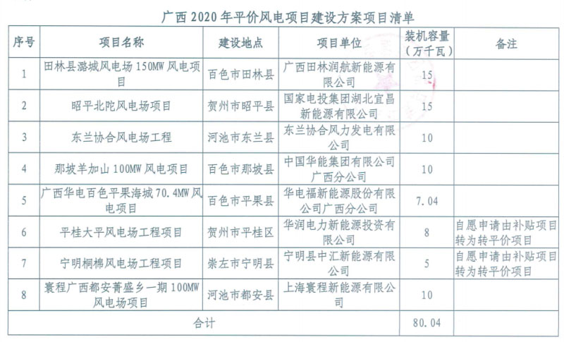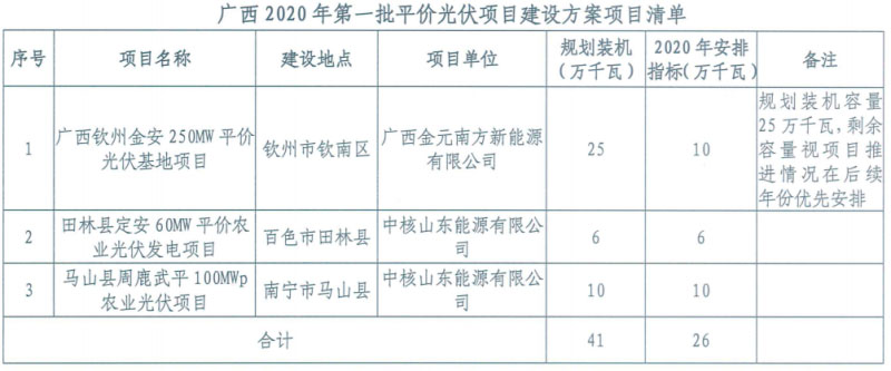 中國儲能網(wǎng)訊:11月27日,廣西壯族自治區(qū)能源局發(fā)布《關(guān)于印發(fā)2020年平價風(fēng)電和第一批平價光伏項目建設(shè)方案》的通知。通知顯示,根據(jù)《國家能源局關(guān)于2020年風(fēng)電、光伏發(fā)電項目建設(shè)有關(guān)事項的通知》廣西壯族自治區(qū)能源局統(tǒng)籌制定了2020年平價風(fēng)電和第一批平價光伏項目建設(shè)方案,其中列入2020年第一批平價光伏項目建設(shè)方案項目共3個,裝機容量26萬千瓦,列入2020年平價風(fēng)電項目建設(shè)方案項目共8個,裝機容量約80萬千瓦。