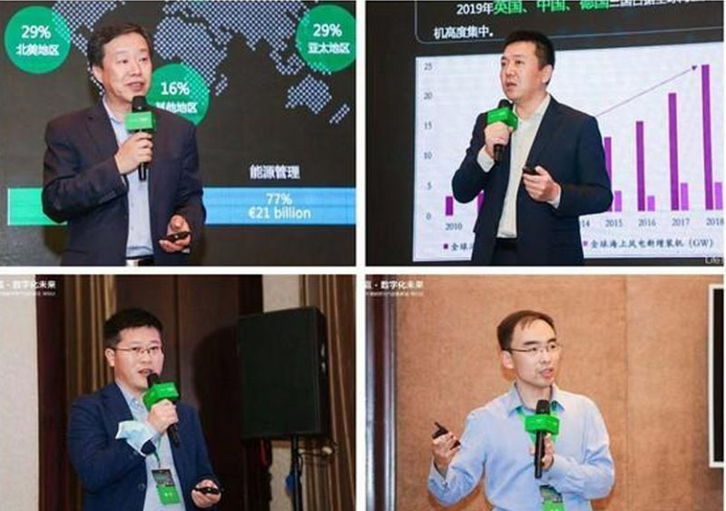 嘉賓演講 (左上:施耐德電氣中國區(qū)副總裁李繼敏,左下:中國化學(xué)與物理電源行業(yè)協(xié)會儲能應(yīng)用分會秘書長劉勇,右上:施耐德電氣能效管理低壓業(yè)務(wù),行業(yè)市場及應(yīng)用部門負(fù)責(zé)人趙天意,右下:北京鑒衡認(rèn)證中心風(fēng)能事業(yè)部總經(jīng)理張宇)