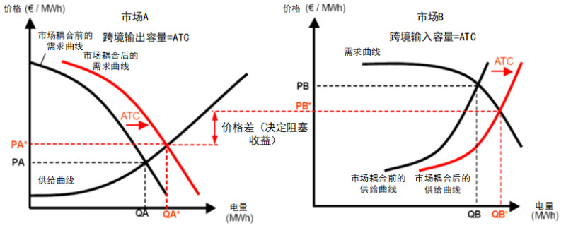 日前市場(chǎng)聯(lián)合出清不考慮各國(guó)(價(jià)區(qū))內(nèi)部輸電阻塞,僅考慮跨國(guó)(價(jià)區(qū))之間的輸電線路容量限制。由TSO向電力交易機(jī)構(gòu)發(fā)布跨境傳輸通道的可用傳輸容量(Available Transmission Capacity,ATC)。市場(chǎng)A和市場(chǎng)B的市場(chǎng)成員各自提交報(bào)價(jià),使用該傳輸容量作為約束進(jìn)行統(tǒng)一優(yōu)化出清,得到各自市場(chǎng)的成交電量及價(jià)格。在區(qū)域間有阻塞和無阻塞情況下各市場(chǎng)出清曲線如下圖所示: