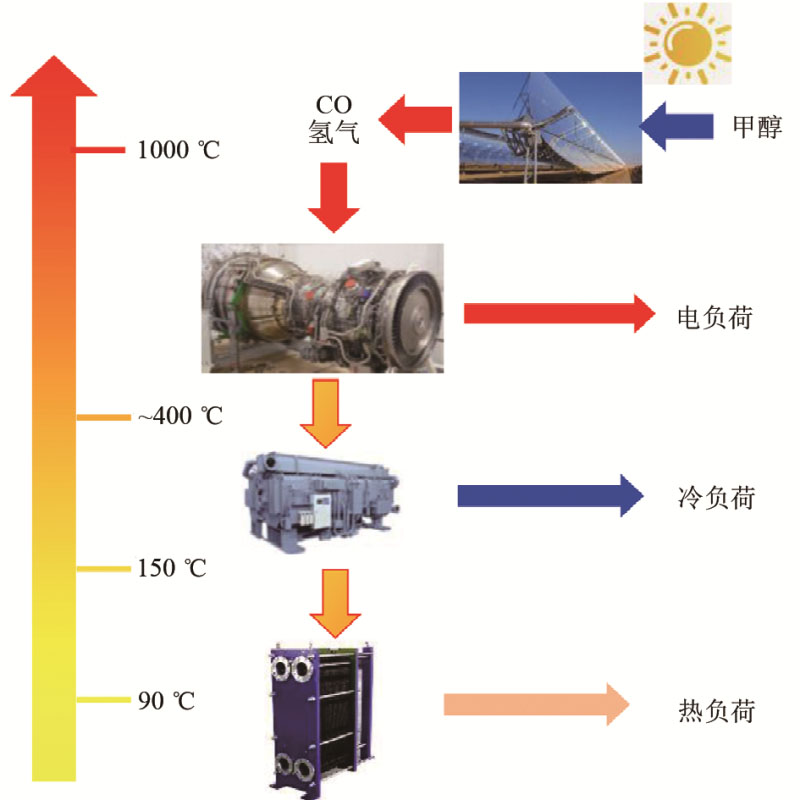 熱化學(xué)蓄熱技術(shù)的耦合應(yīng)用還處于實(shí)驗(yàn)室研究初期,特別是與傳統(tǒng)分布式能源系統(tǒng)耦合應(yīng)用研究較少。Zhang等提出一種熱化學(xué)儲(chǔ)熱技術(shù)與分布式能源系統(tǒng)耦合方式,如圖13所示,甲醇經(jīng)過(guò)槽式太陽(yáng)能集熱器吸收太陽(yáng)能,通過(guò)分解反應(yīng)生成CO和氫氣,之后利用原動(dòng)機(jī)供應(yīng)冷熱電。試驗(yàn)結(jié)果表明,該系統(tǒng)全年能源平均利用率為47.61%。