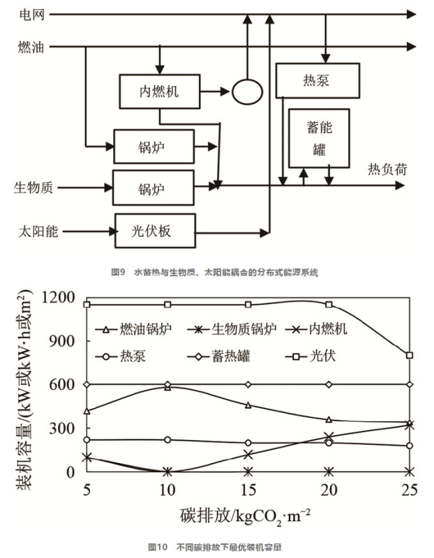 水蓄熱與可再生能源分布式系統(tǒng)的耦合應(yīng)用也得到了一定的研究。彭怡峰等利用蓄熱裝置解決風(fēng)電消納問(wèn)題,建立冷熱電聯(lián)供與蓄熱儲(chǔ)能分布式能源系統(tǒng)運(yùn)行模型,驗(yàn)證了利用蓄熱裝置消納風(fēng)電具有較好的經(jīng)濟(jì)優(yōu)勢(shì)。楊志鵬等進(jìn)一步利用增加新能源的利用,利用光伏、風(fēng)機(jī)、燃料電池、地源熱泵結(jié)合傳統(tǒng)分布式能源系統(tǒng)進(jìn)行蓄熱供暖,如圖8所示,并驗(yàn)證分布式能源系統(tǒng)引入蓄熱技術(shù)具有顯著的經(jīng)濟(jì)效益,燃料費(fèi)用減少19.2%,運(yùn)行成本降低18.1%。Mavromatidis等建立水蓄熱與生物質(zhì)、太陽(yáng)能耦合的分布式能源系統(tǒng),并優(yōu)化了不同碳排放下的最優(yōu)裝機(jī)容量,如圖9和圖10所示。Di Somma等也建立類似系統(tǒng),得到系統(tǒng)年總運(yùn)行成本降低了21%~36%。顏飛龍?zhí)接懥怂顭嵩诜植际教?yáng)能熱發(fā)電技術(shù)中應(yīng)用的可行性,發(fā)現(xiàn)在沒(méi)有太陽(yáng)能輸入的條件下,水蓄熱能夠使系統(tǒng)在平均50%的額定負(fù)荷下持續(xù)工作0.5 h。