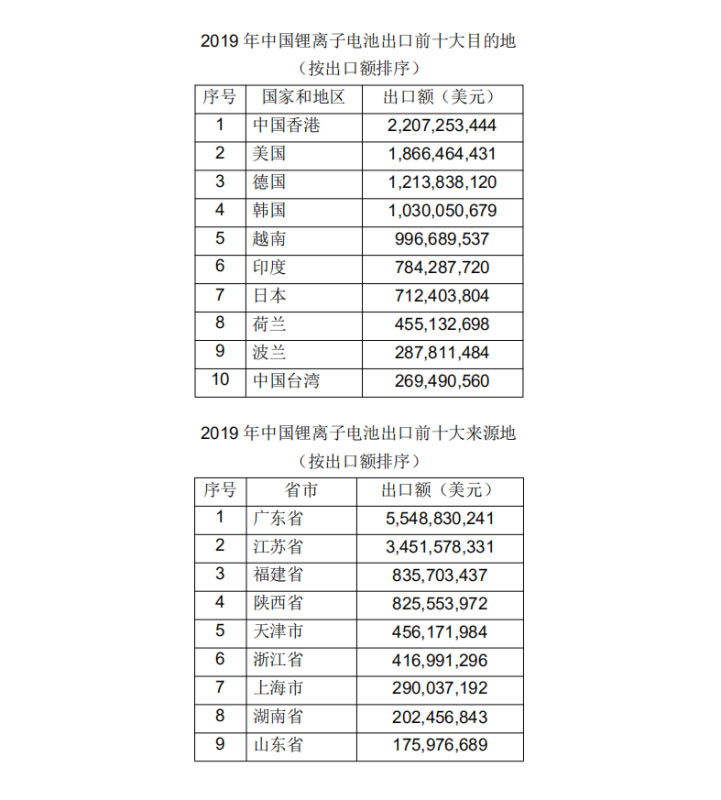 2019年中國鋰離子電池出口總額為130.31億美元,2018年出口總額為108.25億美元,同比增長20.4%。2019年中國各類電池品種出口總額為185.05億美元,鋰離子電池出口額占各類電池總出口額的70.4%。