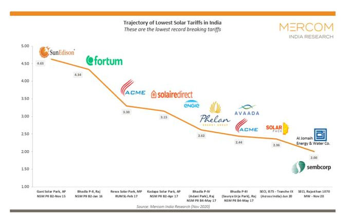 2盧比(約2.7美分)/kWh的最低中標電價比之前的最低歷史電價2.36盧比(約3.19美分)/kWh降低了15%。