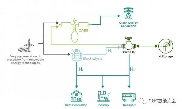 GHH的主要目的是確??稍偕茉垂?,不論天氣如何。具體而言,該項目正在研究建立一個350MW的電解廠、200,000MWh的氫儲存和320MW的壓縮空氣儲能設施的可能性,這些設施作為這一鏈條的最后一環(huán),可以將綠色氫重新轉化為電力。將季節(jié)儲氫和日常儲氫結合在CAES中,可為用戶提供全年24x7小時的100%綠色電力。換句話說,基于風能和太陽能的生產(chǎn),該項目將能夠平衡28萬戶家庭的年用電量。