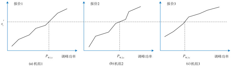 式中,CV為電網(wǎng)調(diào)峰成本;TV為系統(tǒng)需要調(diào)峰的時段;Ni和Nj分別為參與調(diào)峰市場的儲能數(shù)量和火電機(jī)組數(shù)量;s?t為t時段調(diào)峰市場的邊際出清價格;PW,i,t、PW,j,t分別為t時段儲能和火電機(jī)組中標(biāo)的調(diào)峰功率;Rt為t時段系統(tǒng)調(diào)峰需求。邊際出清價格與各市場成員的中標(biāo)功率關(guān)系如圖3所示。