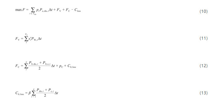 式中,Pt為t時段現(xiàn)貨市場的電價;Tdis為在調(diào)度周期內(nèi)儲能放電的時段;Pe,dis,t為儲能在t時段參與現(xiàn)貨市場的放電功率;FC為新能源企業(yè)給予儲能的補(bǔ)償費用;pC為新能源的上網(wǎng)電價;FV為儲能參與調(diào)峰市場的實際收益;Closs為電池?fù)p耗費用;β為充/放電單位電能折合的電池?fù)p耗費用率;Pdis,t、Pc,t分別為儲能在t時段實際的放電功率和充電功率。