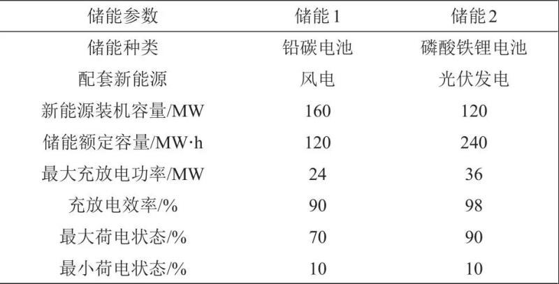 由于西北電網(wǎng)高比例新能源的特性,儲能參與調(diào)峰主要是指新能源大發(fā)時吸收系統(tǒng)電力。為了評估在西北區(qū)域儲能參與調(diào)峰市場對系統(tǒng)經(jīng)濟(jì)及自身效益的影響,對上述模型進(jìn)行仿真分析。本文假設(shè)區(qū)域內(nèi)有一個儲能配合風(fēng)電場運行,一個儲能配合光伏電站運行,主要技術(shù)參數(shù)見表1。