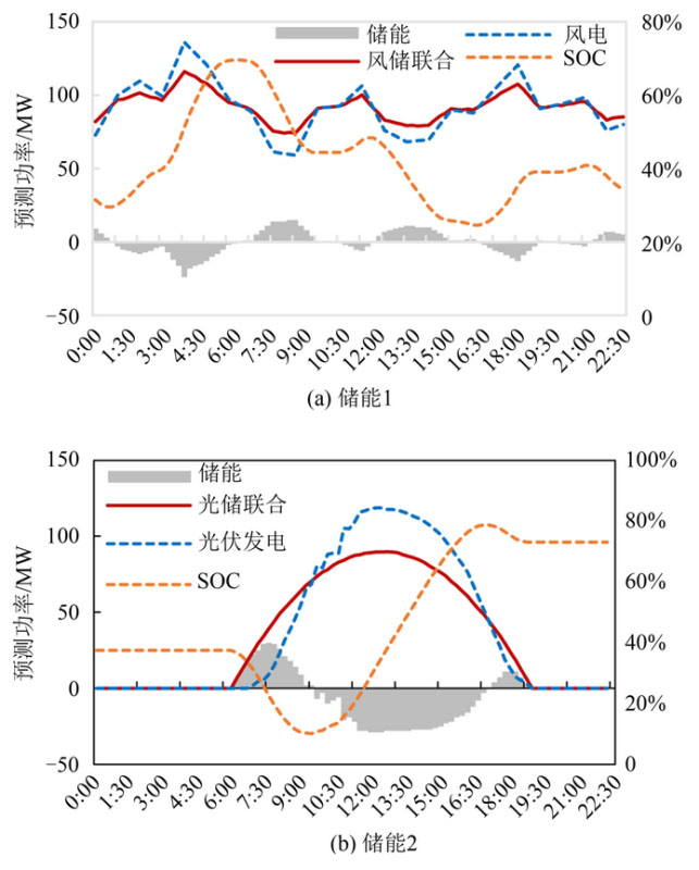 基于次日新能源的出力預(yù)測,得到儲能配合新能源電站運行的充放電行為預(yù)測結(jié)果如圖4所示,其中儲能功率大于0表示放電,小于0表示充電,SOC為對應(yīng)時刻末的荷電狀態(tài)。儲能1和儲能2次日初始時刻(當(dāng)日結(jié)束時刻)儲能容量分別為40 MW·h和90 MW·h。