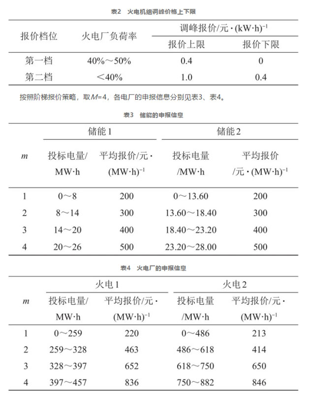 除上文所提的儲能外,另有兩個火電機(jī)組也會參與調(diào)峰交易。市場初期儲能申報價格區(qū)間為0.2~0.5元/(kW·h)?;痣娖髽I(yè)在不同的調(diào)峰檔位,報價上下限見表2。