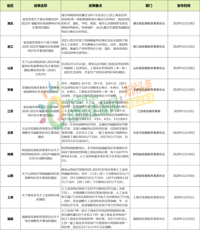 中國(guó)儲(chǔ)能網(wǎng)訊:近日,湖北、浙江、山東、安徽、江蘇、北京、陜西、山西、上海、福建10省市發(fā)改委2021年1月1日起開(kāi)始執(zhí)行最新的電價(jià)。其中,工商業(yè)電價(jià)政策均有調(diào)整。要點(diǎn)如下: