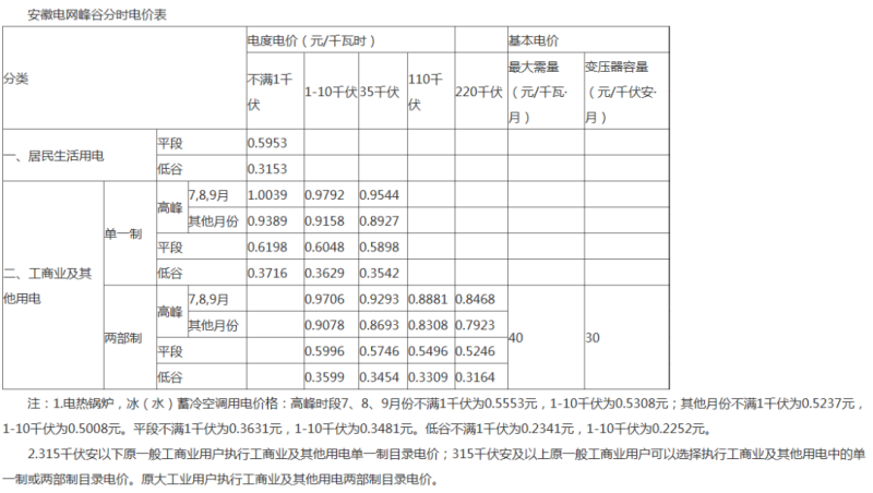 4、安徽省兩部制1-10千伏、35千伏、110千伏、220千伏目錄電價(jià)每千瓦時(shí)分別降低3.46分、4.46分、5.46分、6.96分。