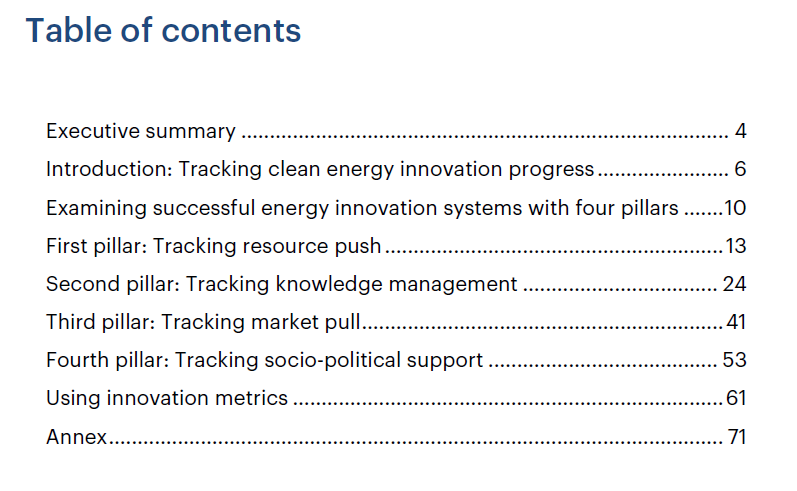 報告中給出的各種指標(biāo),是政府和公司所提議或在實施的指標(biāo),這些指標(biāo)可從各種來源以及與從業(yè)人員的對話中找到。報告中還提供有一些示例,反映出了現(xiàn)有數(shù)據(jù)中得到的諸多見解。但是,更大的機會在于將新的追蹤策略和功能納入到清潔能源創(chuàng)新政策中,這也是能源政策制定的核心。