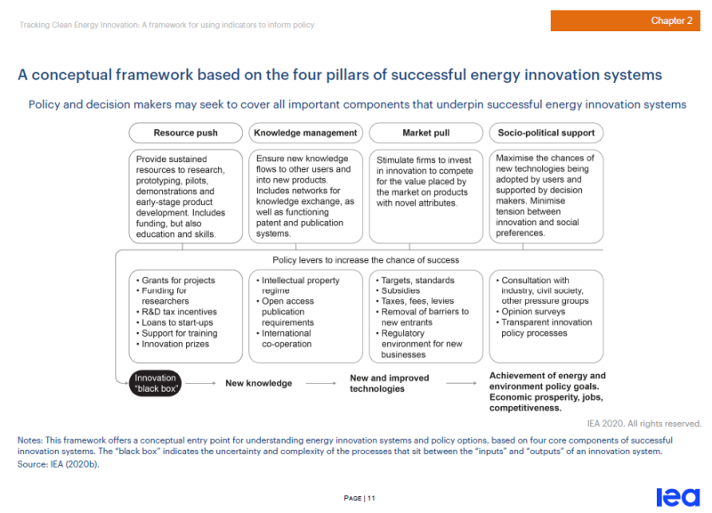 IEA從目前的一些研究和現(xiàn)實世界的政策示例出發(fā),提出了一個四支柱框架結(jié)構(gòu),以表現(xiàn)一組追蹤進度指標(biāo)來反映整個清潔能源創(chuàng)新系統(tǒng)的進度。并針對每一個具體的支柱,給出了廣泛的指標(biāo),并采用目前現(xiàn)有的數(shù)據(jù)進行重點示例。