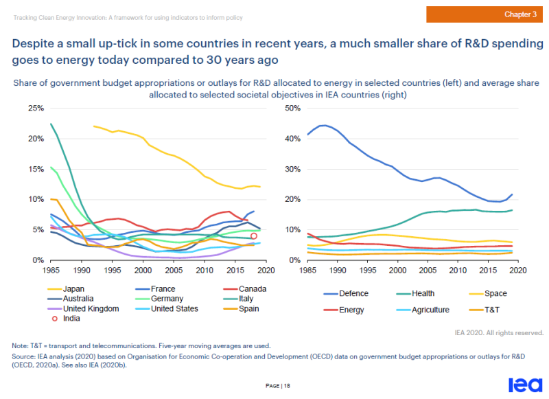盡管近年來一些國家的能源研發(fā)投入還有小幅上漲,但與30年前相比,如今的能源研發(fā)支出份額要小得多。左圖為選定國家分配給能源的政府預(yù)算撥款或研發(fā)支出的份額,右圖為IEA成員國家在各特定社會目標(biāo)上獲得的平均研發(fā)投入份額。