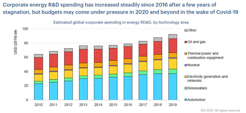 在經(jīng)歷了幾年的停滯之后,企業(yè)能源研發(fā)支出自2016年以來一直保持穩(wěn)定增長,但是在2020年新冠疫情發(fā)生之后,預(yù)算可能會受到壓縮。上圖為按技術(shù)領(lǐng)域分列的全球企業(yè)在能源研發(fā)方面的估計支出??稍偕茉吹谋戎剡€太小。