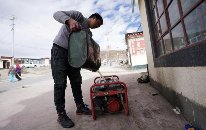 在西藏阿里地區(qū)普蘭縣巴嘎鄉(xiāng)崗莎村,一家飯店的工作人員準(zhǔn)備用發(fā)電機(jī)發(fā)電(11月29日攝)。新華社記者 詹彥 攝