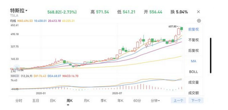 12月4日,雖然受到邁克爾·巴里做空,特斯拉股價(jià)翻轉(zhuǎn),大漲4.32%,收于593.38美元。12月5日,特斯拉收于599.04美元,離600美元一步之遙,總市值則達(dá)到5678億美元。隨著馬斯克頂住了大空頭的第一波攻擊,高盛將特斯拉股票評(píng)級(jí)從中性上調(diào)至買入,并將目標(biāo)價(jià)從455美元上調(diào)至780美元。
