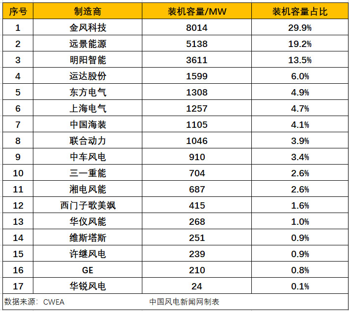 2019年,中國(guó)風(fēng)電有新增裝機(jī)的整機(jī)制造企業(yè)共17家,新增裝機(jī)容量2678.5萬(wàn)千瓦。