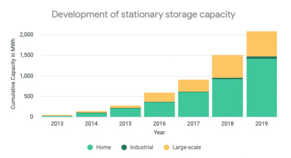 到2019年底,德國住宅儲(chǔ)能、商業(yè)和工業(yè)(C&I)以及大規(guī)模并網(wǎng)的儲(chǔ)能應(yīng)用中累計(jì)部署了儲(chǔ)能容量約2.1GWh電池儲(chǔ)能系統(tǒng)。