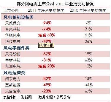 據(jù)中國風(fēng)能協(xié)會(CWEA)統(tǒng)計數(shù)據(jù),2011年金風(fēng)科技和華銳風(fēng)電的裝機容量分列國內(nèi)同行業(yè)的前兩名,兩企業(yè)的市場份額合計37%。兩家企業(yè)的業(yè)績下滑,反映不僅整機制造企業(yè)業(yè)績下滑,風(fēng)電零部件企業(yè)、風(fēng)電運營企業(yè)也均出現(xiàn)業(yè)績下滑或增幅縮窄。