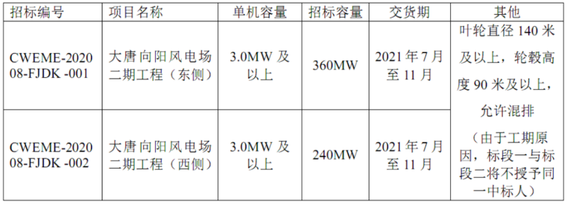 招標(biāo)公告顯示,該項(xiàng)目招標(biāo)容量為360MW,要求投標(biāo)風(fēng)電機(jī)組單機(jī)容量在3.0MW及以上。交貨期定于2021年7月至11月,要求風(fēng)電機(jī)組葉輪直徑在140米高及以上,輪轂高度在90米及以上,允許混排。