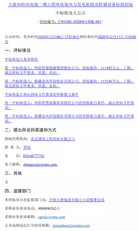 第二中標(biāo)候選人為金風(fēng)科技,投標(biāo)報(bào)價(jià)為115236萬元,折合單位千瓦價(jià)格為3201元/kW。