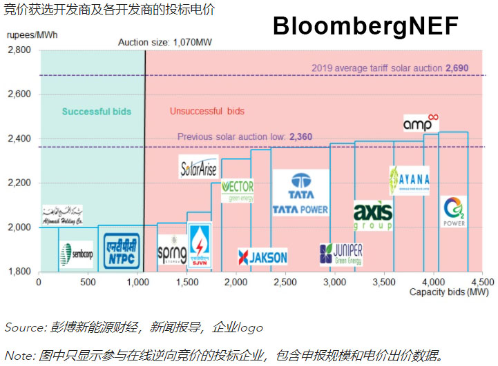 印度太陽能公司(SECI)的1.07GW招標(biāo)獲得超額認(rèn)購,共有14家企業(yè)參與在線逆向競價(jià),3家企業(yè)中標(biāo)。本次光伏競價(jià)中標(biāo)電價(jià)創(chuàng)下新低,沙特阿拉伯Aljomaih能源和水務(wù)公司(200MW)和印度Sembcorp工業(yè)公司(400MW)報(bào)價(jià)僅2000盧比(26.99美元)/MWh。7家獨(dú)立發(fā)電商的出價(jià)均低于此前2020年6月競價(jià)的歷史最低價(jià)2360盧比(31.85美元)/MWh。