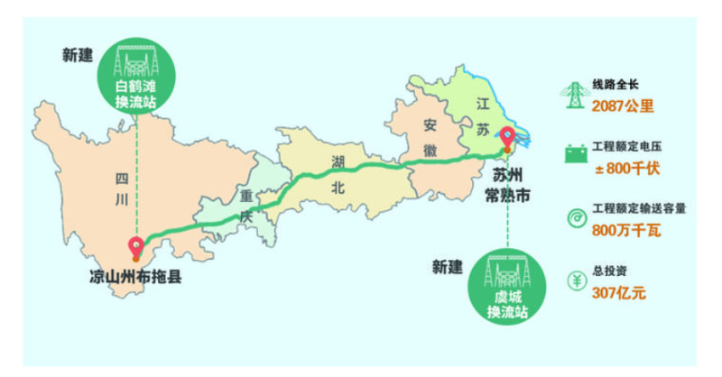 白鶴灘—江蘇工程起于四川省涼山州布拖縣,止于江蘇省蘇州常熟市,途經(jīng)四川、重慶、湖北、安徽、江蘇5?。ㄖ陛犑校?,線路跨越岷江、漢江和長江,途經(jīng)高海拔、重覆冰地區(qū),全長2087公里,新建白鶴灘、虞城2座換流站。工程額定輸送容量800萬千瓦,總投資307億元,計(jì)劃于2022年建成投運(yùn)。工程全面集成特高壓直流和柔性直流輸電技術(shù)優(yōu)勢,在世界上首次采用混合級聯(lián)直流輸電新技術(shù),大幅提升華東電網(wǎng)受電能力,提高電網(wǎng)安全穩(wěn)定運(yùn)行水平。