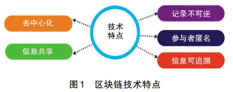 區(qū)塊鏈技術(shù)是分布式數(shù)據(jù)存儲、點對點傳輸、共識機制、加密算法等計算機技術(shù)在互聯(lián)網(wǎng)時代的創(chuàng)新應(yīng)用,具有去中心化、信息共享、記錄不可逆、參與者匿名和信息可追溯等技術(shù)特點(見圖1)。