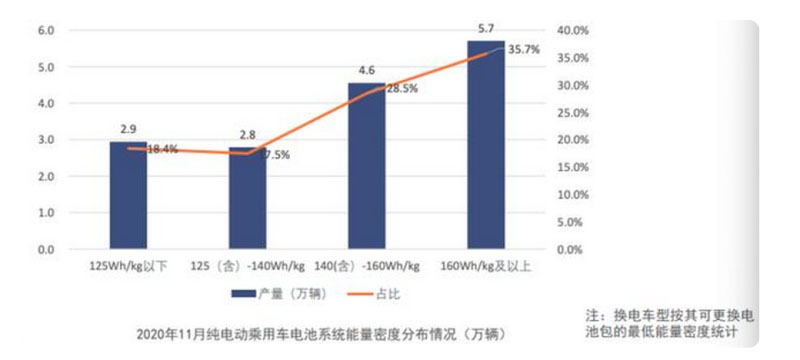 11月,我國純電動乘用車系統(tǒng)能量密度在140(含)-160Wh/kg和160Wh/kg及以上車型產量分別為4.6萬輛和4.7萬輛,占比分別為28.5%和35.7%,125Wh/kg以下車型產量2.9萬輛,占比18.4%,較10月份下降4.4個百分點。