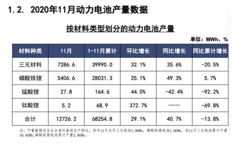 11月,我國動力電池產量共計12.7GWh,同比增長40.7%,環(huán)比增長29.1%。其中三元電池產量7.3GWh,占總產量57.3%,同比增長35.6%,環(huán)比增長32.1%;磷酸鐵鋰電池產量5.4GWh,占總產量42.5%,同比增長49.3%,環(huán)比增長25.1%。