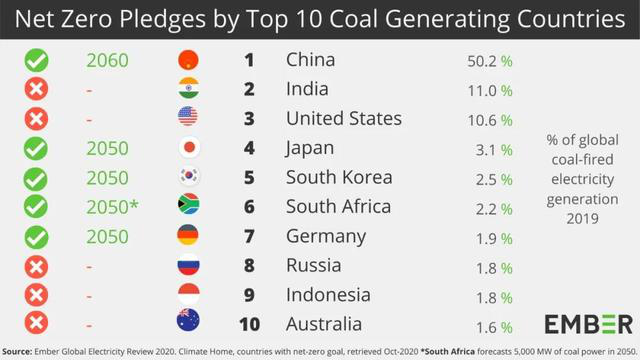 根據(jù)Ember Global Electricity Review Match 2020 報(bào)告,在全球十大煤電國(guó)家中,中國(guó)、日本、韓國(guó)這三個(gè)東亞國(guó)家分別位居第一、四、五位。他們也先后提出“碳中和”的實(shí)現(xiàn)目標(biāo)時(shí)間。