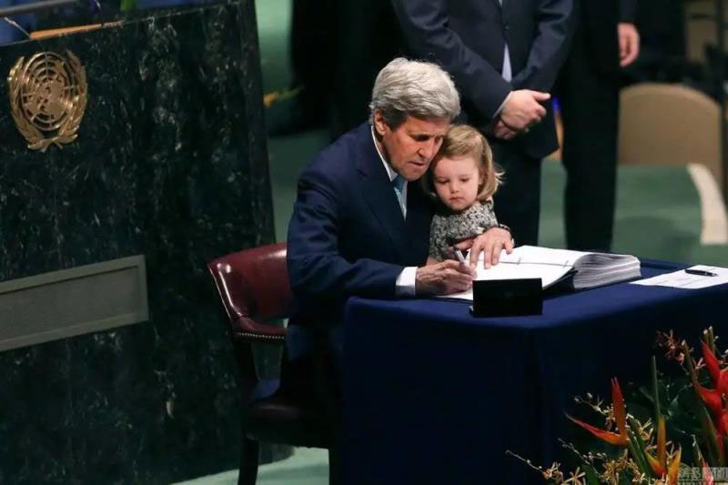 2016年,時(shí)任美國(guó)國(guó)務(wù)卿克里抱著孫女簽署了《巴黎協(xié)定》