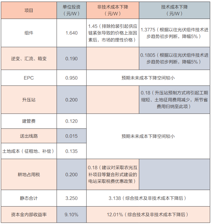 以10萬KW光伏項(xiàng)目可優(yōu)化的造價(jià)空間為例,綜合技術(shù)及非技術(shù)成本后,預(yù)測(cè)單位靜態(tài)投資可下降0.112元/W,資本金內(nèi)部收益率約可提高三個(gè)百分點(diǎn)。