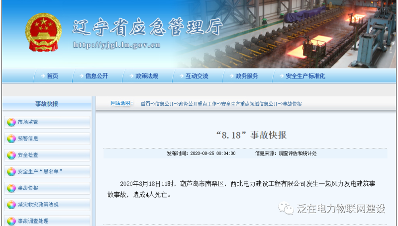 事故17.8月18日,遼寧省葫蘆島市發(fā)生一起風(fēng)電事故,4人死亡。