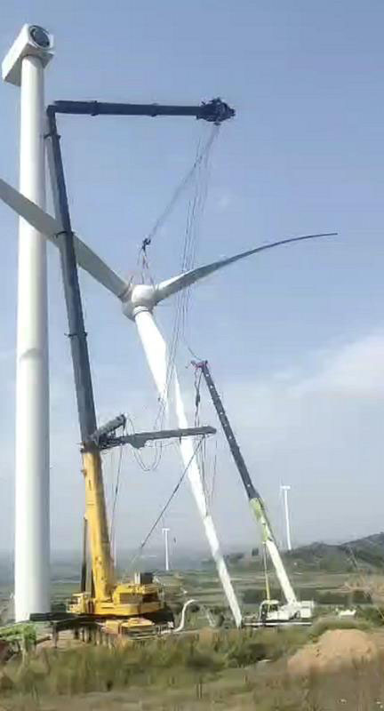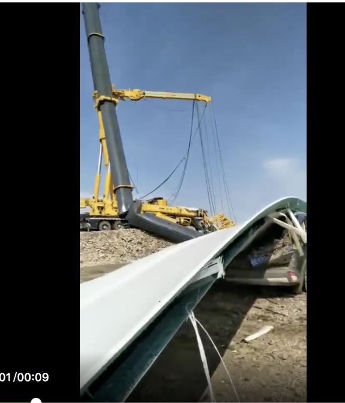 某河北張家口與白旗交界處風(fēng)電項(xiàng)目在進(jìn)行吊裝工作時(shí)發(fā)生事故,事故造成一輛徐工1200噸吊車斷臂、一輛中聯(lián)80噸吊車斷臂,三片風(fēng)機(jī)葉片墜地?fù)p壞,一輛小轎車被墜落的葉片壓壞,現(xiàn)場(chǎng)傷亡情況未知。視頻如下: