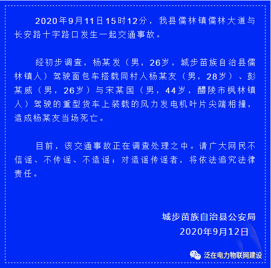 根據(jù)城步苗族自治縣公安局消息,9月11日,湖南省邵陽市城步苗族自治縣公安局通報(bào)一起交通事故,一輛面包車與重型貨車上裝載的風(fēng)電葉片尖端相撞,葉片從面包車前窗插進(jìn)車內(nèi)后,直抵后排座椅,造成1死1傷!